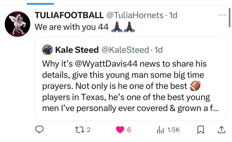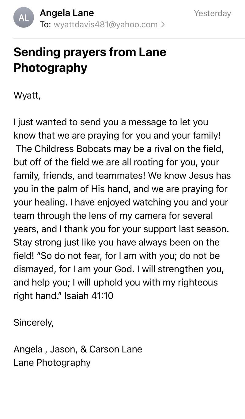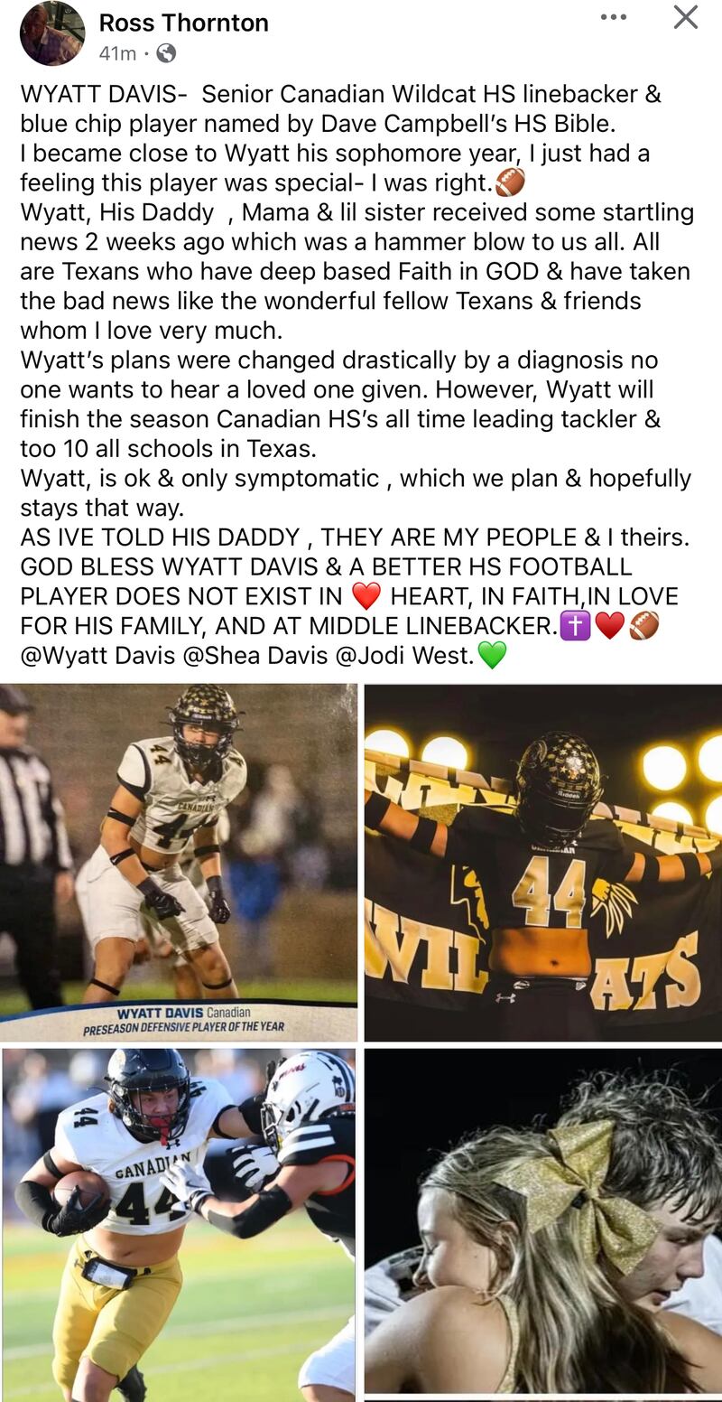 Wyatt’s mother, Jodie Davis, was the first to hear the news. She was in the car with him, driving to Dallas with tickets to the Texas vs. Oklahoma football game. She pulled over to a gas station in Childress to get out of the car.