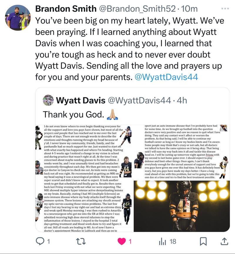 Just two games after his diagnosis, he was medically cleared to play again, taking the field against Friona. By that time, Wyatt didn’t just have Canadian cheering him on, but the power of the entire Texas Panhandle.