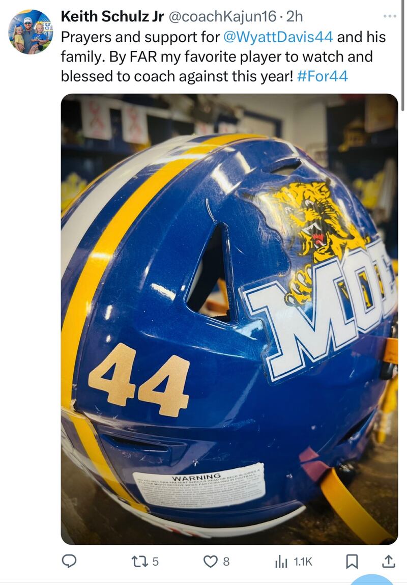 He received messages from across the area, from coaches, to media figures, and even musical artists. Teams across the Panhandle, including the ones he played against, wore helmet stickers with “44,” Wyatt’s number.